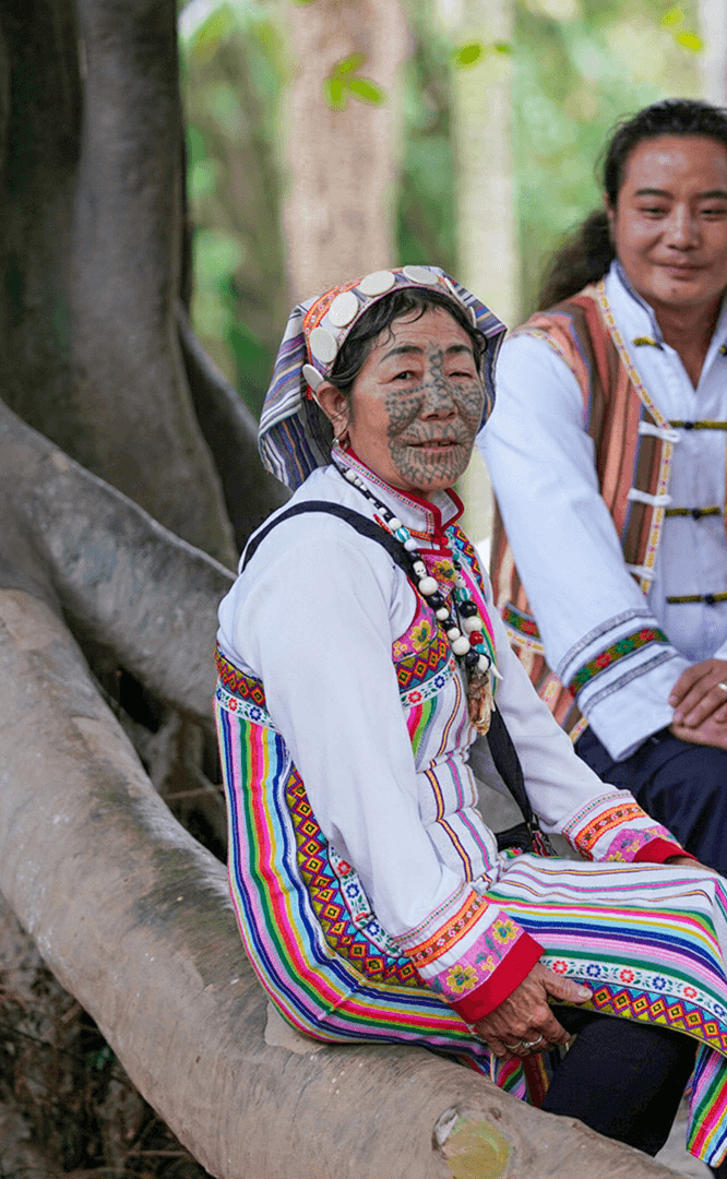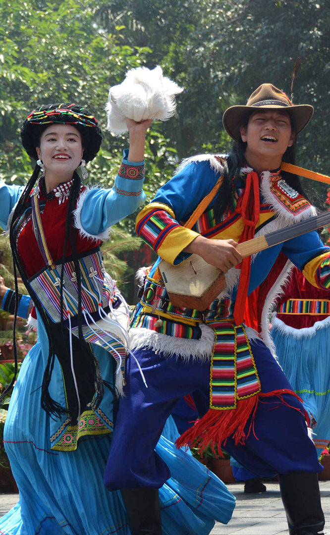 彝族在云南境內(nèi)約471萬人,是省內(nèi)人口最多、分布最廣的少數(shù)民族,主要聚居在金沙江、元江流域和哀牢山、無量山腹地。彝族是一個(gè)能歌善舞的民族,民間打歌、跳樂之風(fēng)盛行,大三弦、跌腳舞久負(fù)盛名。火把節(jié)是彝族最具特色的民族節(jié)日。彝族村占地50余畝,三虎浮雕墻與虎頭內(nèi)祖師形象表現(xiàn)了彝族虎鷹文化。太陽(yáng)歷廣場(chǎng)圖騰柱上有太陽(yáng)、虎、火和八卦圖形象,周圍環(huán)繞著10個(gè)朝向不同的月球造型,外圓周有12生肖石雕。依山而建的“...